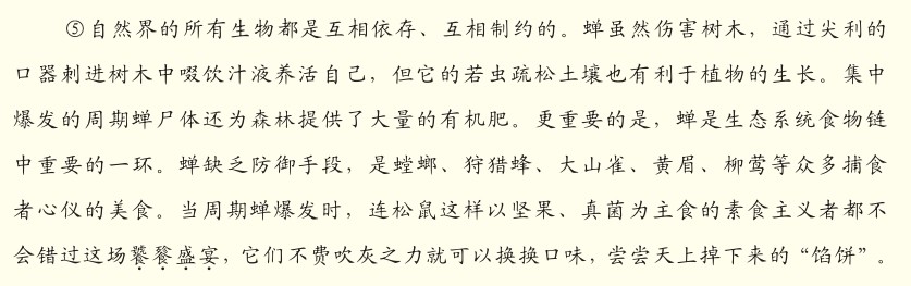 C.第⑤段加点词“饕餮盛宴”,意思是松鼠把“蝉”当作绝佳美味。这个词语体现了说明文语言的生动性。