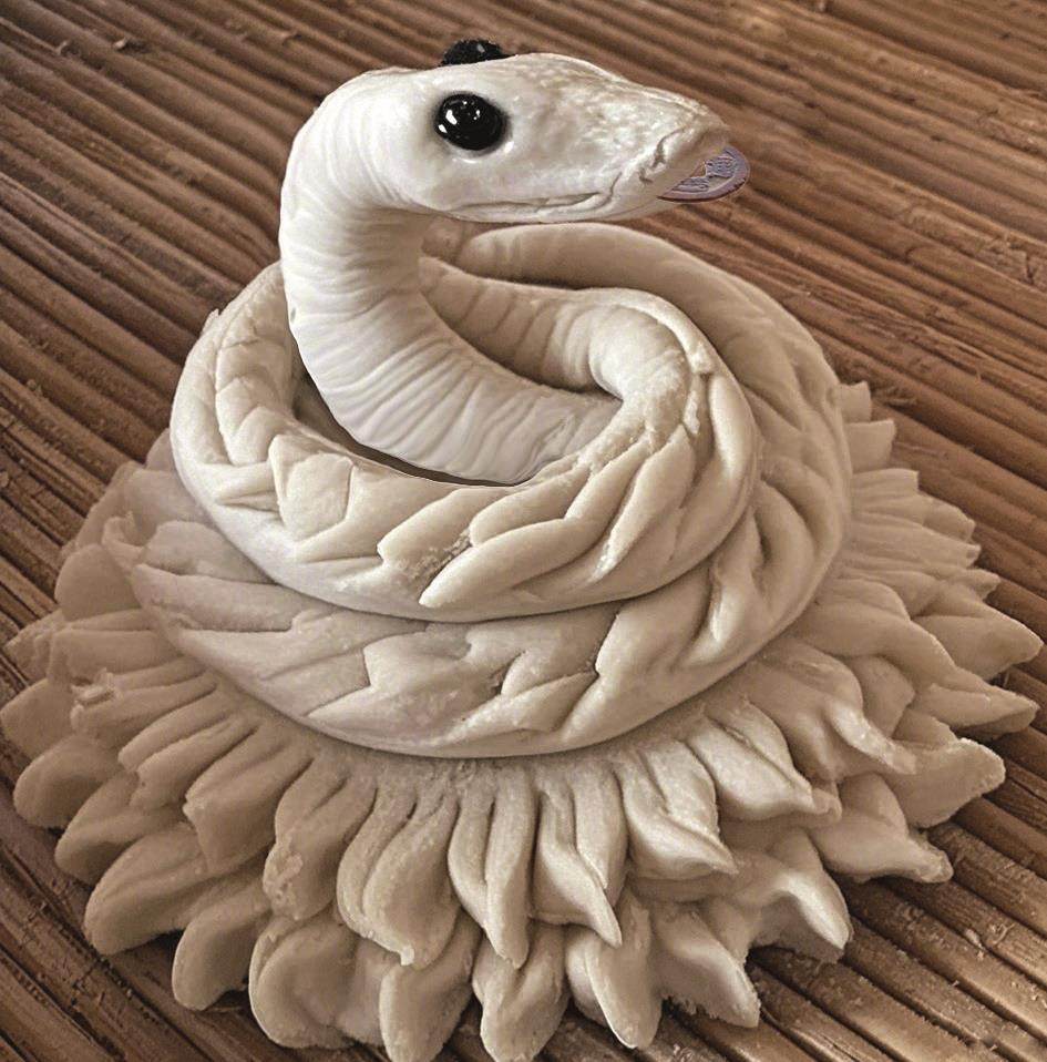 蛇盘盘,也称“蛇婆婆”,系山西、陕西一带的传统食品。制作蛇盘盘,先将发酵的白面盘成蛇状,然后在“蛇”的头部用两粒高粱米当眼睛,还会在“蛇”的嘴里放置一枚铜钱,最后上笼蒸熟。当地人认为铜钱为财、蛇为绳,二者结合,寓意发财致富。