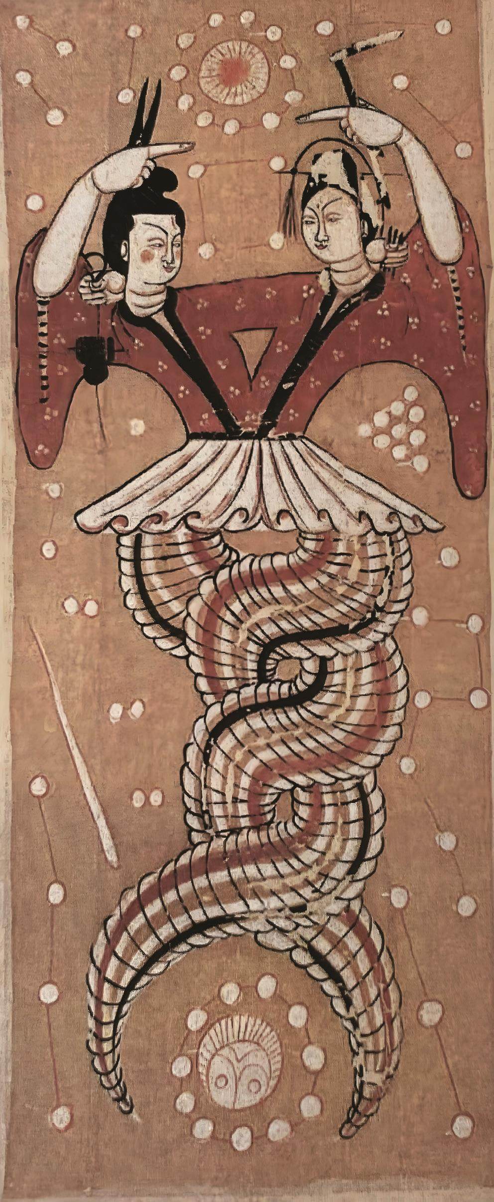 后世伏羲、女娲的蛇躯造型应该就是这种蛇图腾崇拜的延续。作为中华民族敬仰的人文始祖,伏羲立八卦、创文字、造渔网,施教于民;女娲乃“古之神圣女,化万物者也”,她抟黄土造人、熔五色石补天。出现在传统影像中的伏羲、女娲多呈上身分开、下身交织的造型,“伏羲鳞身,女娲蛇躯”,伏羲一手持矩,女娲一手持规。在全国多地的考古发现中,均有伏羲、女娲的蛇躯造型,如河南南阳出土的汉代伏羲、女娲画像砖,山东嘉祥出土的汉代画像石,新疆吐鲁番阿斯塔那唐墓出土的伏羲、女娲绢画,等等。