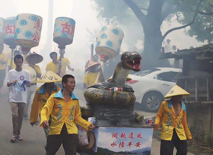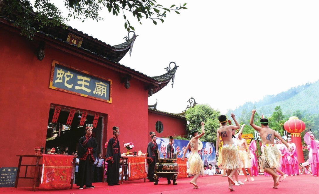 在闽北地区,每年农历七月初七都要举行祀蛇赛神的庆典。明人谢肇淛在《长溪琐语》中记载:“水口以上有地名朱船坂,有蛇王庙,庙内有蛇数百,夏秋之间赛神一次。蛇之大者或缠人腰,或缠人头出赛。”每年农历六月下旬,南平市樟湖镇一带的男子便去野外捕蛇,之后交给蛇王庙巫师(俗称“蛇爸”)集中喂养。到七月初七这天,捕蛇者从巫师处认领一条活蛇,参加迎蛇王菩萨的游行。他们或将蛇握在手上,或将蛇盘在肩上,簇拥着蛇王菩萨舆驾前行。游行结束后,巫师将蛇在闽江放生,继而演戏酬神。