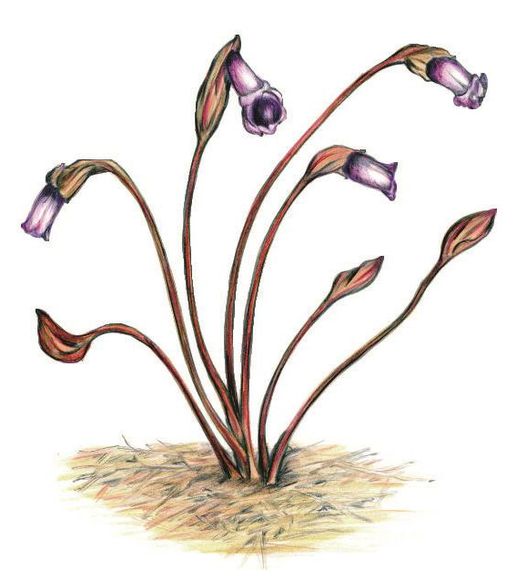 眼镜蛇瓶子草耐冷怕热,却喜欢生长在有光照的地方,只是环境温度不能太高。它们会在4—6月开花,且只开一朵花。其花序基生,萼片黄绿色,披针形;花瓣呈暗红色至紫色,披针形至长圆形,无毛,具横向脉;花茎长25~90厘米,通常比成熟的叶片高10~25厘米。