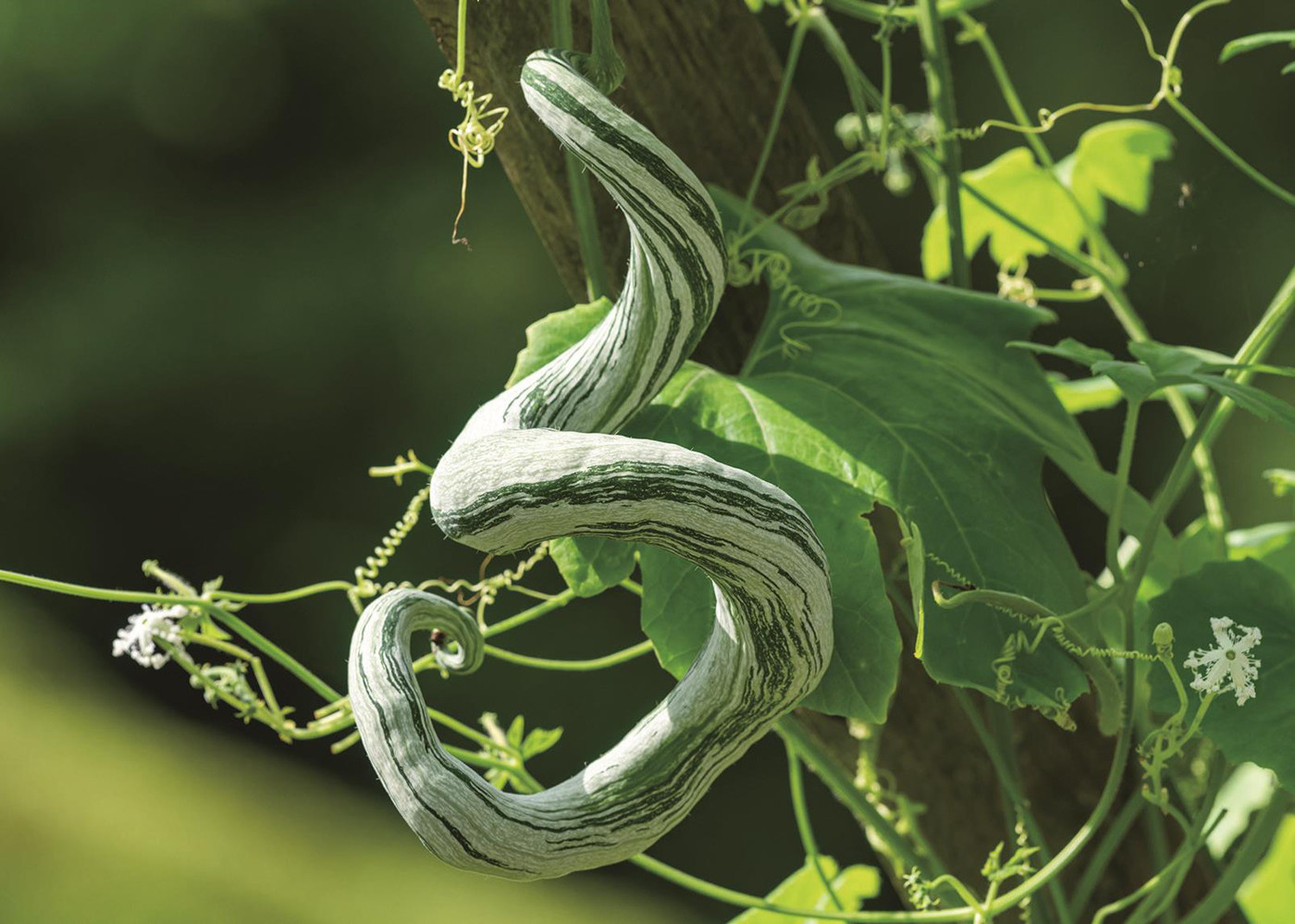 蛇瓜是葫芦科栝楼属一年生攀缘藤本植物,别名蛇豆、豆角黄瓜、蛇丝瓜等,因外形酷似蛇而得名。