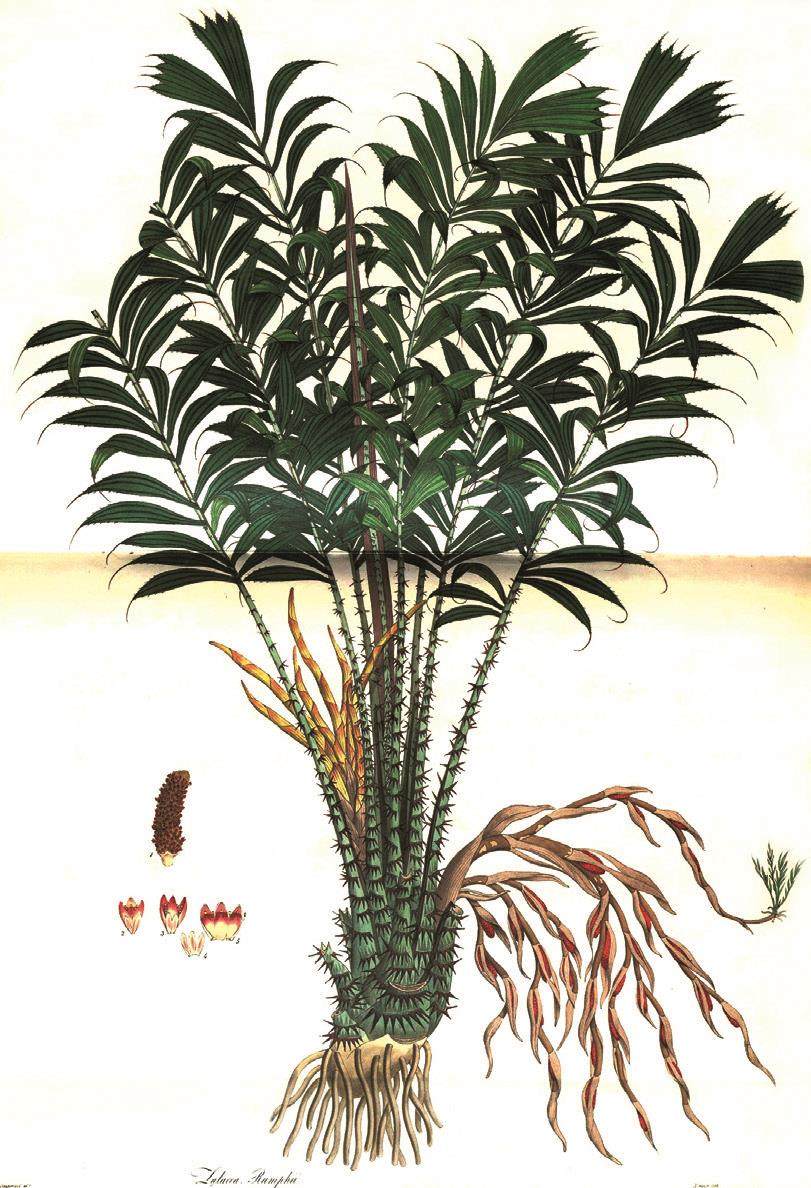 蛇皮果属于棕榈科蛇皮果属植物,其植株相对较小,与原产于东南亚的草本植物油棕榈类似。蛇皮果雌雄异株,植株丛生,短茎或无茎,有刺。叶自根部丛生,高3~4米,叶羽状全裂,羽片披针形或线状披针形,呈“S”形或镰刀形。花序生于叶间,雌雄花序异型。雄花序具有分枝,着生几个柔荑状圆柱形的分枝花序,总花序梗及分枝被包于宿存的佛焰苞内,雄花成对着生于小佛焰苞(苞片)的腋部,通常伴随着有毛的小苞片。雌花序的分枝比雄花序少,但较大;雌花成对着生或单生,比雄花大。果实丛生于根部叶腋处,呈球形、陀螺形或卵球形,顶端具残留柱头,外果皮薄,有以覆瓦状反折的鳞片,鳞片顶尖光滑或呈刺状尖,中果皮薄,内果皮不明显。种子长圆形、球形或钝三棱形,肉质种皮厚。