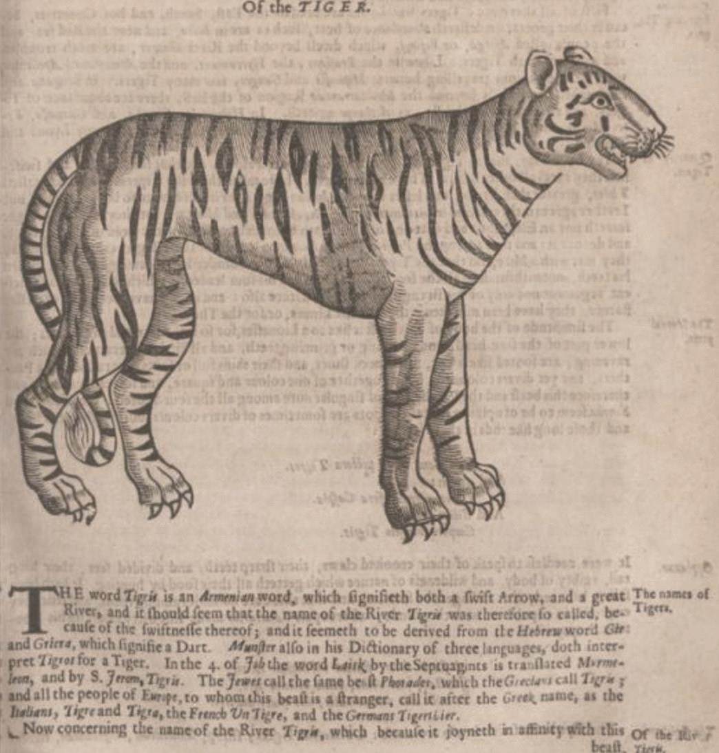 哥伦布发现新大陆之后,欧洲航海家带回了包括亚洲老虎在内的许多珍稀动物。与日本的“照猫画虎”类似,欧洲人习惯用他们熟悉的狮子来描述老虎。如16世纪出版的《博物学者》一书将老虎定义为“像狮子一样的四足动物,不过有更长、更弯曲的鼻子”。1658年,英国动物学家爱德华·托普塞尔在《四足动物、蛇及昆虫的历史》一书中基于狮子的形象对老虎进行描述:“这种野兽的身体、脸和嘴巴都像母狮,前额下半部分和露出牙齿时与所有猛兽一样。它的脚像猫,脖子短,毛皮上散布着花纹,但不是像豹和潜鸟身上那种斑点花纹。它的花纹只有一个颜色,而且不是方形就是长条形。”同时可以看到,书中插图上的老虎四腿细长,头略小,看起来更像豹子。直到今天,“拦路虎”在英语中仍表述为“A lion in a way”。