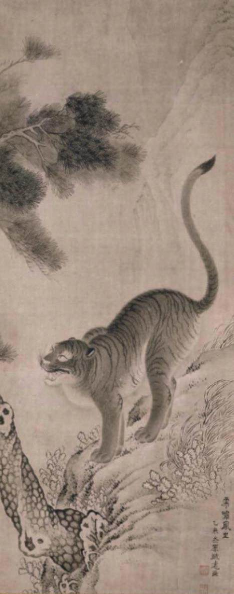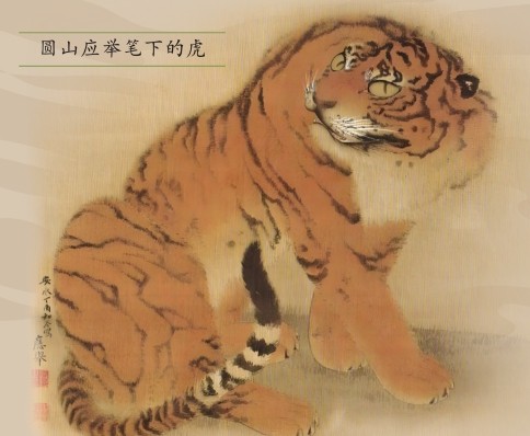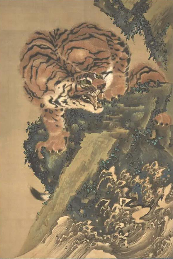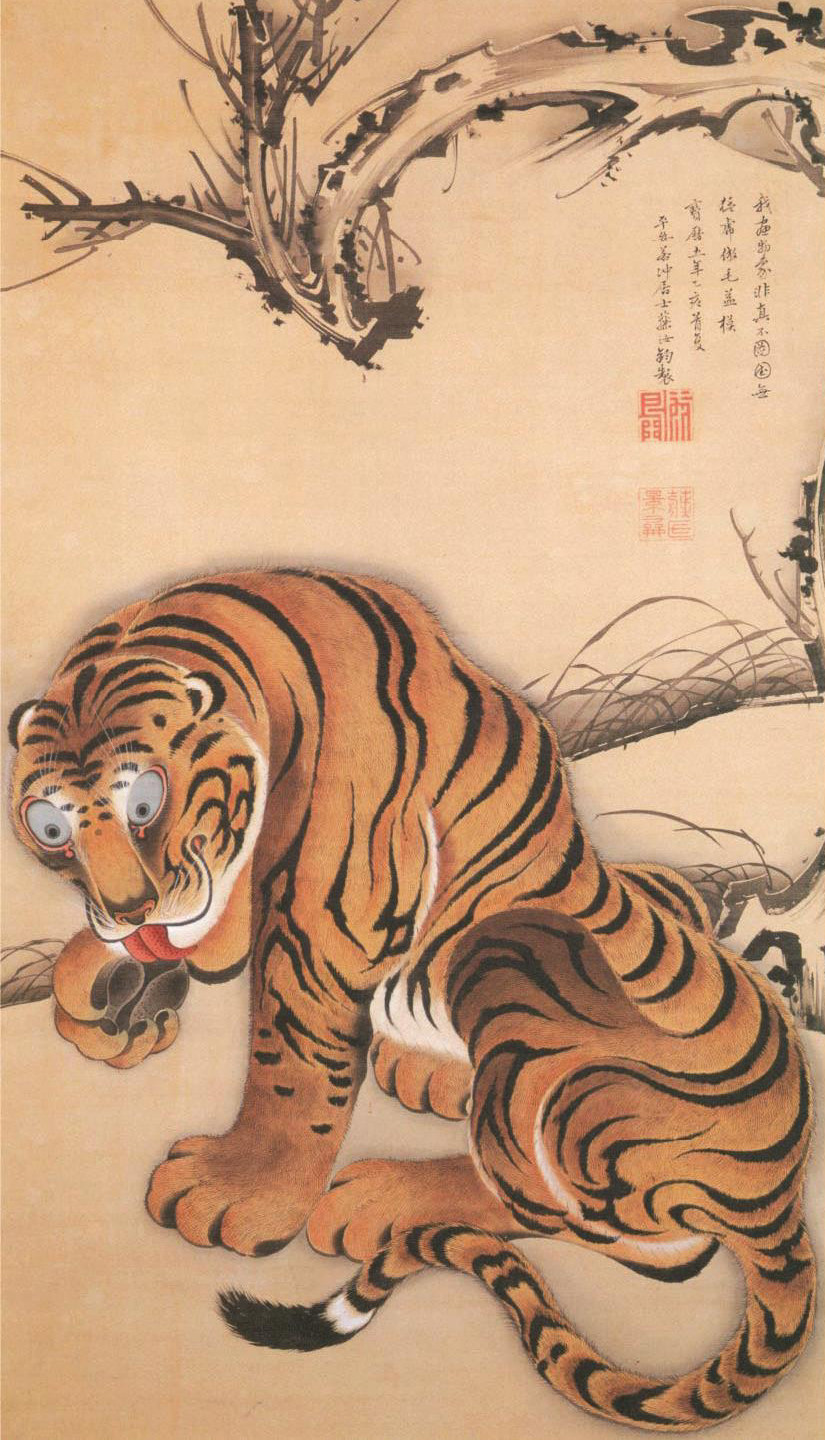从室町时代到江户时代(1336—1868年),日本涌现出许多画老虎的画家,如雪村周继、伊藤若冲、圆山应举、长泽芦雪、岸驹、谷文晁等。有趣的是,这些画家笔下的老虎与真实的老虎相差甚大。画作中的老虎或卧身单体岩石之上,或徘徊孤树之下,体形瘦弱、肢爪绵软,虽虎口微张却媚态十足,丝毫没有猛虎下山的气势,也不见虎视眈眈的凶悍;有的老虎身形比例失调,眼鼻错位,样子颇为滑稽,倒像是受尽委屈的家猫,或是灰头土脸的败犬。之所以出现“画虎不成反类犬”的情况,可能是因为日本没有老虎,画家们要画虎,只能临摹中国画作,或者照猫画虎、照虎皮画虎。对此,长泽芦雪也大方承认:“日本没有老虎,所以我们临摹中国画(李公麟《猛虎》)。”