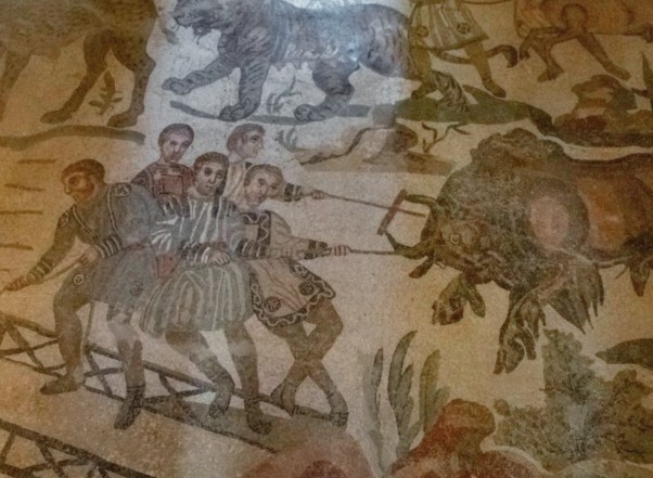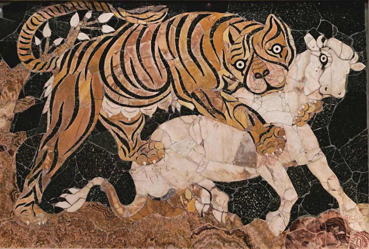 从历史遗存的角度看,老虎现身古罗马的时间更早一些。如意大利西西里岛卡萨尔的古罗马别墅遗址中就有老虎的画像。该别墅建于4世纪,12世纪被废弃。在1950年的考古发掘中,人们在别墅地面和墙壁上发现了大量绘有动物的马赛克镶嵌画,在其中一幅镶嵌画中,人们正将大象、羚羊、老虎等动物牵引上船(见左上图)。在另一幅珍藏于罗马卡皮托利内博物馆的2世纪的壁画上,一只老虎正在撕咬一头类似公牛的动物(见左下图)。