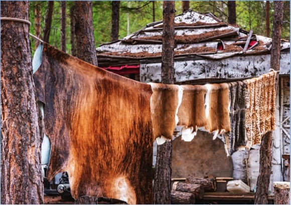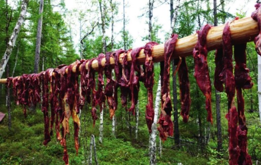 在林区生活的鄂温克人大多以肉类为主食,他们通过狩猎、养殖等方式获得肉类,食用方法较为简单方便—煮熟后直接食用;剩余肉类则被制作成腊肉或晾晒成肉条、肉干,这样方便长时间储存,外出狩猎时亦可随身携带充当干粮。值得一提的是,除食用肉类之外,林区的使鹿鄂温克人还有一种非常重要的乳类食物—驯鹿奶。除了直接饮用外,他们还用驯鹿奶制作奶茶,或用驯鹿奶和面发酵烙成“卡拉巴”(即发面饼)。