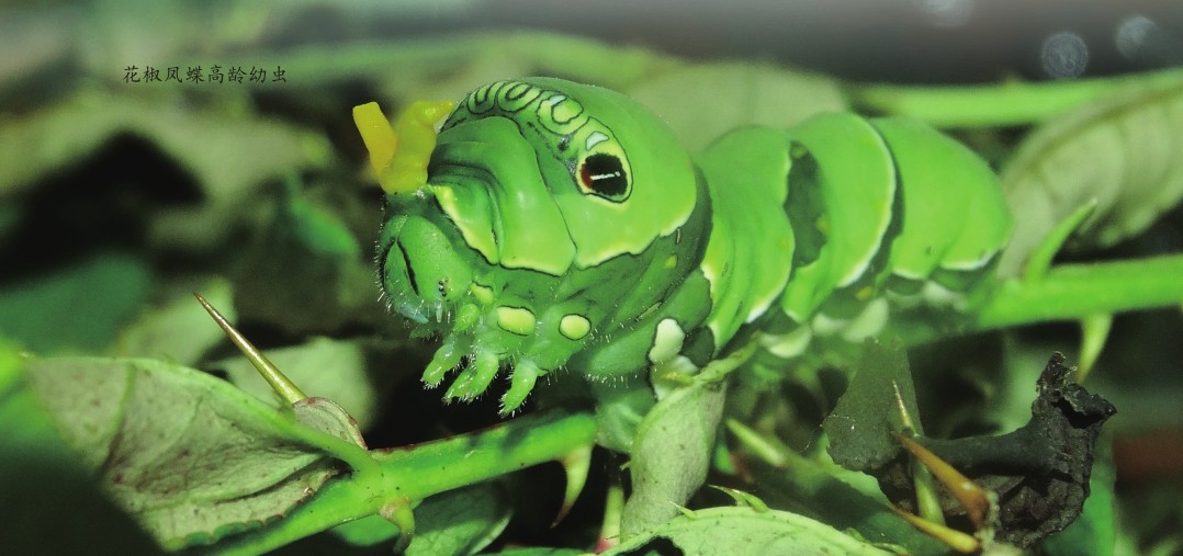 花椒凤蝶的幼虫将拟态手段发挥到了极致。2—4龄幼虫的长相不敢恭维:虫体黑褐色,黏糊糊的,看上去像一粒鸟粪。随着不断发育,花椒凤蝶老熟幼虫的体长可长到近5厘米,再模仿鸟粪显然骗不了捕食者,所以在完成第4次蜕皮后,老熟幼虫的体色就变成了鲜艳的黄绿色,后胸两侧还有蛇形眼线纹,头也特别大,看上去很像蛇头。受到惊吓时,老熟幼虫会抬起“蛇头”,伸出两条橙黄色的触须,这两条触须不仅像极了蛇信子,还会散发出难闻的味道。“蛇头”“蛇眼““蛇信子”“怪味”,这一套“组合拳”打下来,不把捕食者吓走才怪呢。