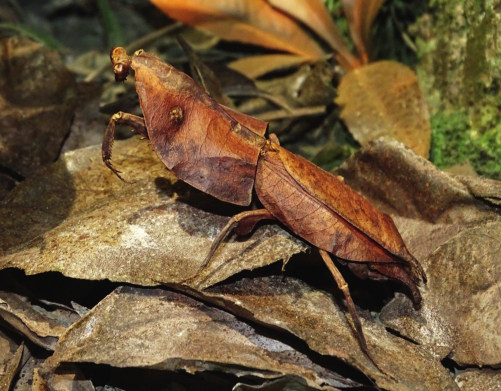 枯叶螳螂主要分布于马来西亚、菲律宾等亚洲东南部的热带雨林。体长5~9厘米,头呈三角形,复眼大而亮,触角细长,体色棕色,有枯叶状背板。不同种类的枯叶螳螂主要根据前胸上方背板的形状来进行区分,常见的有菱背枯叶螳、勾背枯叶螳和眼镜蛇枯叶螳等。其中,眼镜蛇枯叶螳是伪装能力最强的一种,因为它既像枯叶,又像眼镜蛇。眼镜蛇枯叶螳有着还原度极高的特化胸背板,等待猎物时,它像枯叶;遇到天敌或受到惊吓时,它会抬起头部和颈部,使其看上去很像眼镜蛇的头部和颈部;同时,它还会张开前翅和后翅,露出鲜艳的体色来恐吓天敌。