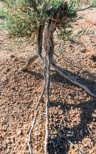 沙漠中的植物的根系不但长度惊人,而且往往盘根错节,这是为了适应极端干旱的环境和稳固自身。 首先,沙漠环境极端干旱,地表水分极少,难以满足植物生长的基本需求。为了生存,沙漠植物必须将根系深深扎入地下,穿越层层沙砾,触及地层深处的珍贵地下水。这种长长的根系如同探水器,为植物提供持续的水分供应,确保它们在极端干旱条件下的生存和繁衍 。其次,沙漠中的风沙极其猛烈,一场突如其来的沙尘暴可能会摧毁脆弱的植物。发达的根系能够使植物抵抗风力,在沙漠中稳固生长。