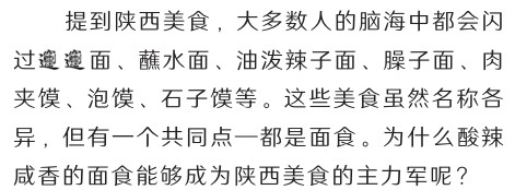 凭借得天独厚的农业生产条件,关中平原成为最早的天府之国、华夏粮仓。传说“农业始祖”后稷自小喜爱农艺,长大后更是教民稼穑、为民造福,开创了光辉灿烂的农耕文化。这一传说流行了4000余年,2009年,“农业始祖后稷传说”被列为陕西省非物质文化遗产。从地形来看,由河流的冲积和黄土堆积作用形成的关中平原地势平坦、土壤肥沃,为小麦种植提供了土壤条件。从水源来看,关中平原水资源充足。西汉司马相如在《上林赋》中就有“荡荡乎八川分流,相背而异态”的描述,这正是后世所称的“八水绕长安”。今天的渭河、泾河、沣河、涝河、潏河、滈河、浐河和灞河八条河流奔腾其间,为小麦种植提供了水源保障。从气候来看,关中平原属于暖温带半湿润半干旱气候类型,年平均气温12~14℃,无霜期为200~220天,为小麦种植提供了适宜的温度条件。陕西因地形、水源、气候等优越的自然地理要素成为小麦的主产区,而丰富的小麦产量也为陕西赢得了“碳水之都”的美誉。