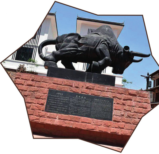 黑井古镇的产业与黑井息息相通,而黑井的起源则与黑牛脉脉相连。所有的故事,都要从一头黑牛谈起。《新纂云南通志》中记载,唐代有一位叫李阿召的彝族姑娘,放牧时偶然发现,有一头黑牛总是独自去一处山崖舔食渗透出来的山泉。更让她感到奇怪的是,在牛群中唯有这头黑牛毛色黑亮、身体健壮。李阿召十分好奇,便去尝了一口那里的山泉水,惊奇地发现这山泉水竟是盐水,于是报南诏官府开采盐卤。《黑盐井志》中记载:“土人李阿召牧牛山间,一牛倍肥泽,后失牛,因迹之,至井处,牛舔地出盐。”无论哪种说法,黑牛、李阿召与盐都均紧密相连。为了纪念这头寻到盐卤的黑牛,人们将这口井命名为“黑牛盐井”,也称“大井盐井”,后简称“黑井”,黑井古镇也由此得名。