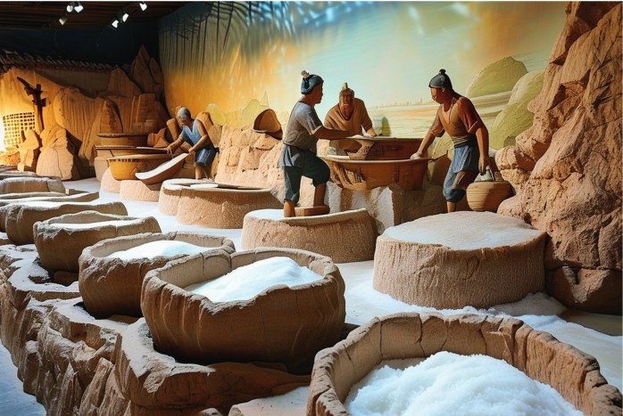 每日灶房一般是午后生火煮盐,通常配备4名灶夫,为首的是灶上的掌勺师傅,手下有2名助手,灶下有1人专门负责烧火。经过一夜的温火烘烤,大锅里的盐终于熬成了。由于是用大锅熬制而成,所以黑井盐也被称作“锅盐”“大锅盐”;再者,因为熬好的锅盐平整如镜,所以一锅盐又被称作“一平盐”,由此诞生了盐的特殊计量单位—平。