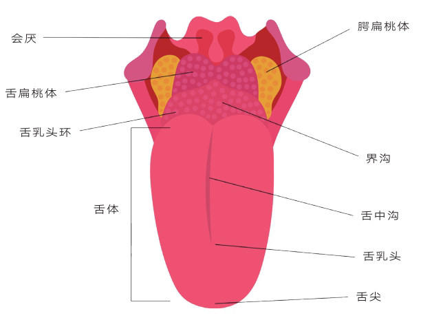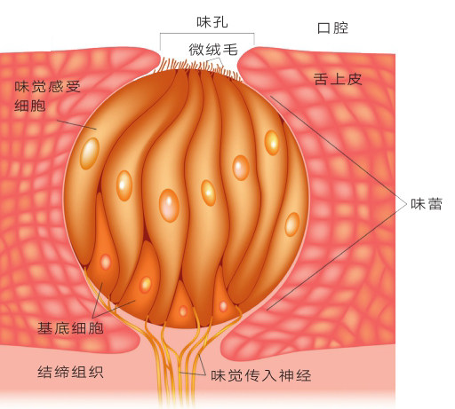 哺乳动物的主要味觉感受器官是舌。味蕾则是最基本的味觉感受单元,人类味蕾总数平均约10万个,主要分布于舌背部表面和舌缘,其次是软腭、咽喉和会厌等部位。味觉是一种近感,即只有当食物入口后人们才能品尝到味道。味蕾的顶端有味孔,进食过程中,人类通过味蕾微绒毛结构中的味觉受体识别食物中的“味质”,并将激活后的信号转化为神经冲动,神经冲动沿着面神经、舌咽神经和迷走神经传至大脑味觉中枢,产生酸、咸、苦、甜、鲜五种基本味觉。比如,食物中的氢离子、钠离子和钾离子可分别激活味蕾中的酸味感觉受体、咸味感觉受体和苦味感觉受体,糖类和谷氨酸钠可分别激活甜味感觉受体和鲜味感觉受体。受体的敏感度还受食物温度的影响。总之,食物在口腔里激活各种味觉受体且程度不同,于是产生了千变万化的滋味。