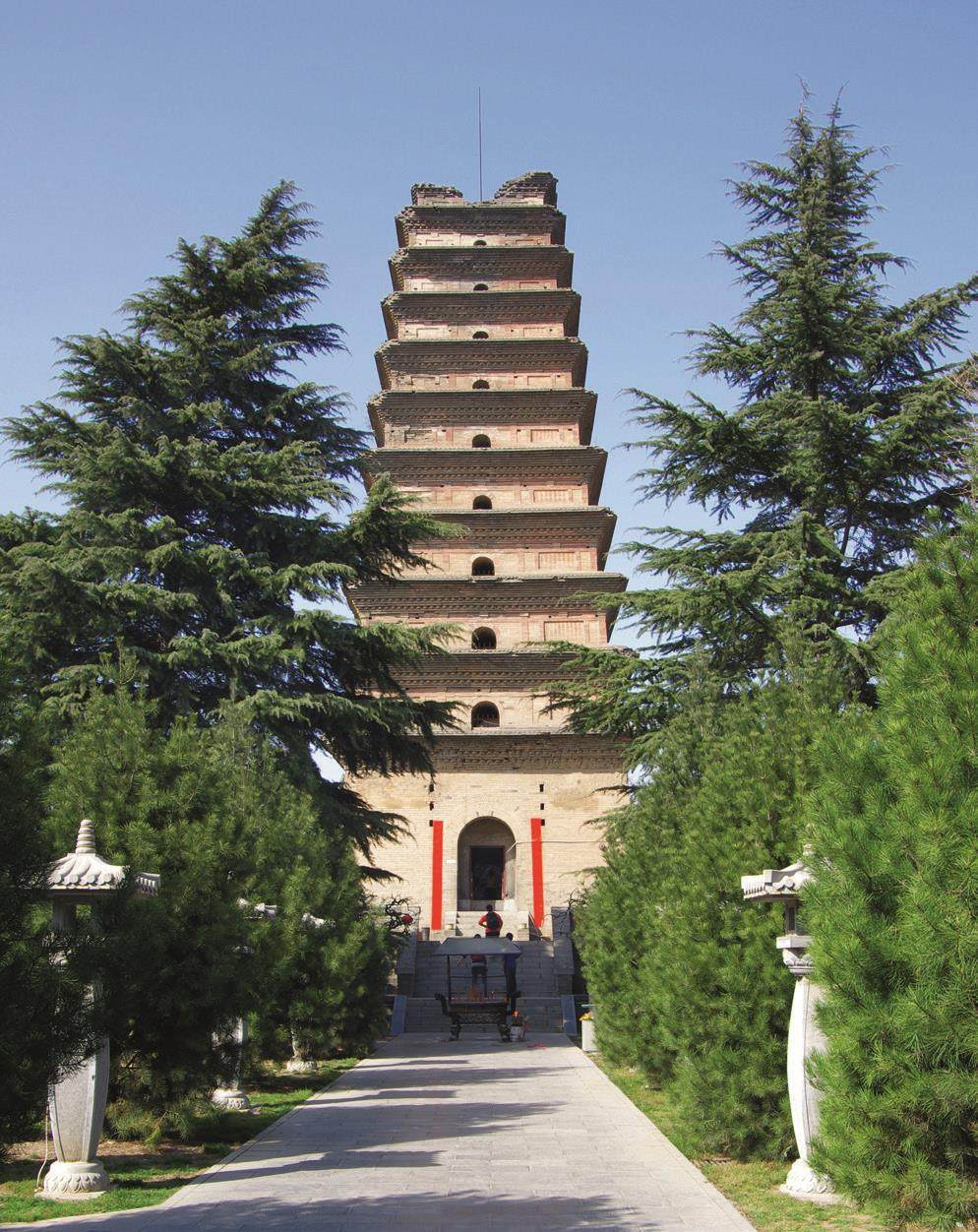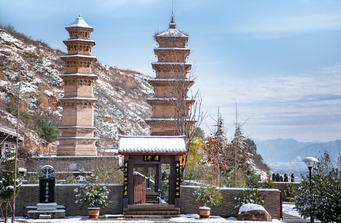 今天如若登临华严寺,就会发现两座灵骨塔一大一小、相互辉映。东边为杜顺塔,西边为澄观塔。杜顺塔为方形七层楼阁式砖塔,高约21米,上层刻有横额“严主”二字,第三层嵌有“无垢净光宝塔”六字碣。澄观塔为六角七层楼式砖塔,高约17米,塔上嵌有“大唐僧统清凉国师妙觉之塔”十二字碣。