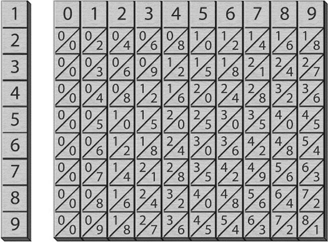 英国数学家亨利·布里格斯慕名远道而来,专程拜访了纳皮尔。布里格斯向纳皮尔请教:“阁下,您凭什么样的智慧,用如此简单的方法(对数)来帮助天文学家?”1617年,布里格斯发表了第一张常用对数表。布里格斯的拜访,对纳皮尔来说是一个巨大的鼓励。随后,纳皮尔发明了小数点和纳皮尔棒,并为牛顿的微积分学奠定了基础。纳皮尔棒是一种由动物的骨、牙、角等制成的计算工具。在纳皮尔棒上写有密密麻麻的阿拉伯数字,其实这就是一个乘法表。每个小格都用一根斜线划分成两个部分,左上部分的数字为十位数,右下部分的数字为个位数。纳皮尔提出的对数概念,极大地推动了数学的发展,并为计算尺的诞生奠定了理论基础。