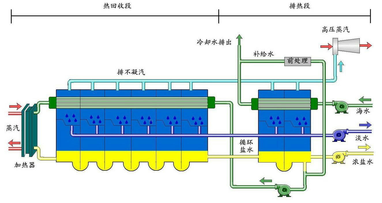 多效蒸馏的特点是热效率高、操作弹性大、能耗较低、操作安全可靠,但设备体积较大、装置费用较高,一般与火电站联合建设,近年发展较快。因为原料海水的最高蒸发温度一般低于70℃,所以也被称为低温多效蒸馏,通过多次蒸发和冷凝,得到数倍于加热蒸汽量的蒸馏水。