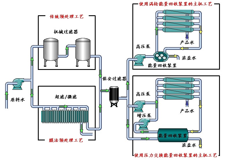 反渗透法是一种大众较为熟知的滤水技术,日常家用净水器多采用这一技术。其特点是投资较少,规模灵活,但对预处理要求较高,如冬季需对原料海水进行预热处理。