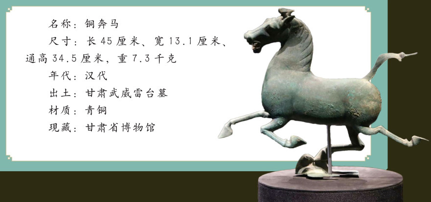“马踏飞燕”是这件文物的“艺名”,它的官方名称为“铜奔马”,1969年出土于甘肃省武威市雷台的一座墓葬中。不同于墓葬中出土的其他铜马,铜奔马的造型异常矫健精美,整体呈昂首嘶鸣、飞跃奔驰状。马首微微向左偏,长尾飘举在半空,三足腾空,右后足踏在一只飞鸟之上;飞鸟展翅回首,注目惊视。这样的设计不仅体现出了马奔腾的速度之快,还充分表现了当时工匠丰富的想象力以及高超的nyRG8QoETmEJctooSQvAEaQgVpl7eGtDW4HFmsOFHik=铸铜工艺。马将所有力量集中在一足之上,却能安稳不失平衡,属实令人叹为观止,就连见多识广的著名历史学家、文学家郭沫若见到它后,也被震撼到惊叹连连,先是为其取名为“铜奔马”,后又重新命名为广为人知的“马踏飞燕”。