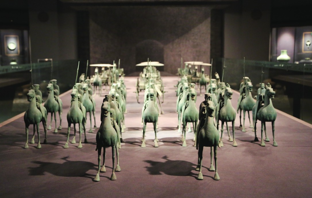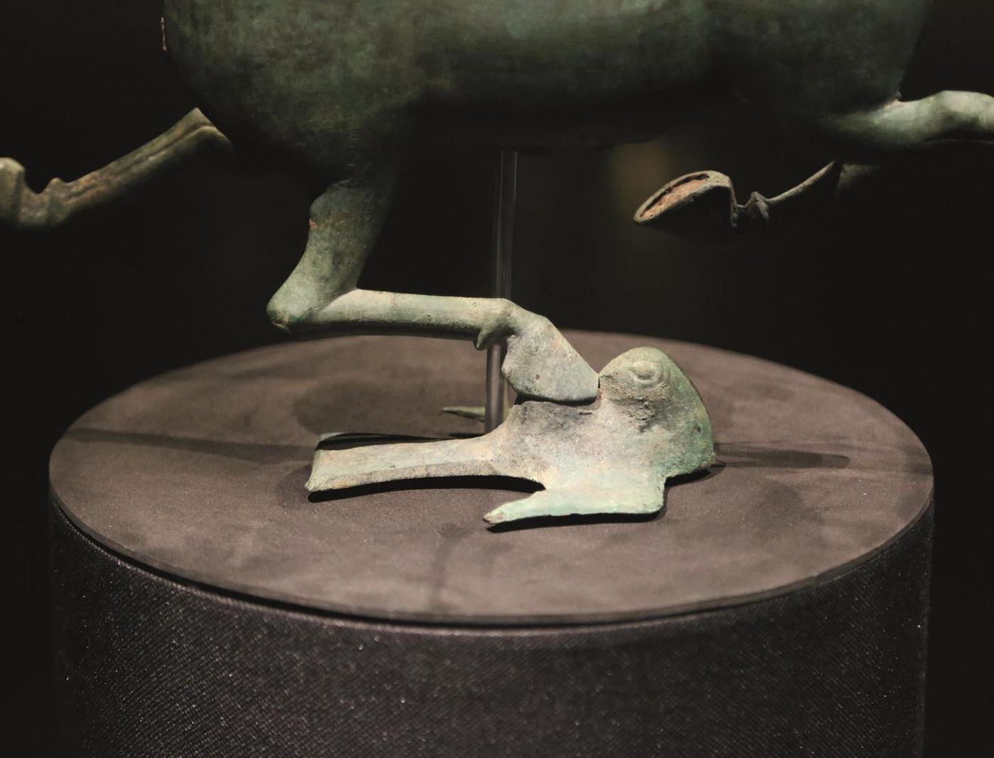 只不过,不论是“马踏飞燕”“马踏飞隼”,还是“马超龙雀”“天马逮乌”,抑或是“马踏鸩鸟”,飞鸟本身为何物,或许已经不再那么重要了。铜奔马融合了写实主义与浪漫主义的创作手法,将观者领入艺术的幻境之中,让人深刻地体会到汉代工匠的高超技艺,领略到汉王朝的强盛、自信及开放的胸襟。透物见人,这才是铜奔马最具魅力的地方吧。当然,铜奔马自由奔放、勇于向前的精神象征,与我们新时代的节拍也十分吻合。