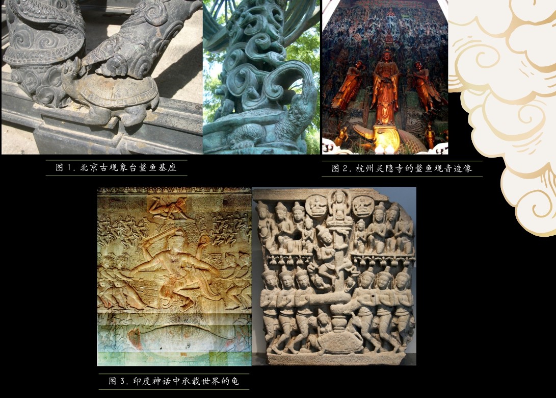 我国许多地方的民间故事中都流传着地震是“鳌鱼翻身”“鳌鱼换肩”的传说(图1)。这一源头可以追溯到《列子》中的记载:天帝命15只巨鳌轮流托举岱舆、员峤、方壶、瀛洲、蓬莱5座海上仙山,每6万年轮换一次。当巨鳌换班时,仙山就会发生剧烈的震荡。后来,6只巨鳌被龙伯之国的巨人钓走,导致两座仙山沉没。佛教传入我国后,沿海地区多见“鳌鱼观音”造像(图2),人们祈求以之压制住作乱的鳌鱼,换来人间河清海晏。自宋至清,庆祝元宵节时数千盏彩灯堆成的巨型灯山叫“鳌山”,如同光彩辉煌的神仙世界,寓意吉庆和祥瑞。