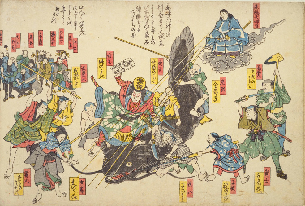 1855年,日本江户(今东京)发生安政大地震。据统计,这次地震造成超过7000人死亡,超过1.5万间房屋倒塌。此次地震正值“神无月”(农历十月),传说日本的所有神灵在这个月都要去出云聚会,“要石”的镇压失灵,导致鲶鱼挣扎甩尾,引发地震。震后,名为“鲶绘”的木版彩图迅速流行开来,主角都是地震的始作俑者—鲶鱼,它们或是被神仙镇压,或是被愤怒的凡人群殴,或是被禁锢谢罪,或是被人们做成烤鱼,以解心头之恨(图9至图13)。