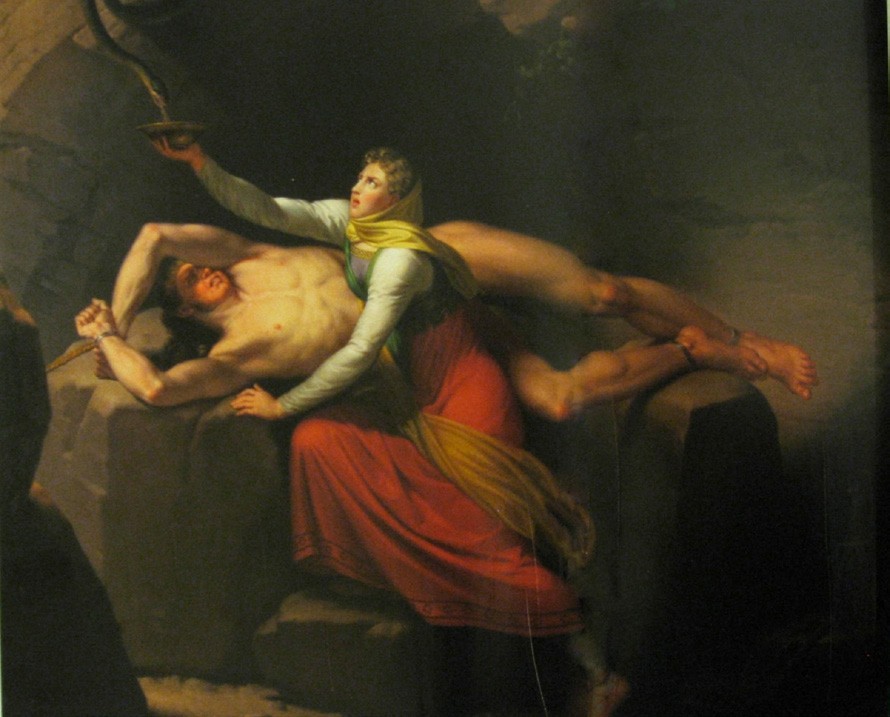 北欧神话将地震归结于众神之父奥丁对谎言与诡计之神洛基的惩处。因为害死了光明之神巴德尔,洛基受到了严厉的惩罚。他被捆绑在地底的岩石上,头顶盘踞着一条毒蛇,毒液不断滴落在洛基脸上,让他遭受难忍的灼痛。直到“诸神的黄昏”,也即世界末日来临,洛基的束缚才会解除。洛基的妻子西格恩守在他身边,用碗承接毒液,不让毒液落到丈夫脸上,为他减轻痛苦(图18)。当碗装满毒液需要倒空时,被毒液滴到的洛基颤抖挣扎,造成地震。