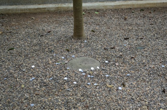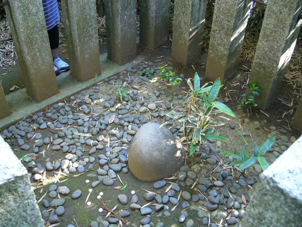 随着时间的推移,约在江户时代初期(17世纪),日本传说里的主流“地震制造者”成了生活在水底污泥层的鲶鱼。人们观察到鲶鱼在地震前异常活跃,于是鲶鱼成为神话的现实来源。位于茨城县的鹿岛神宫和香取神宫内各陈设着一块半埋于土中的石头(图6和图7)。据说,江户时代初期的大名德川光圀曾试图将石头挖出,挖了七天七夜,仍然无法将石头撼动分毫。原来,它们就是镇压引发地震的大鲶鱼的“要石”。