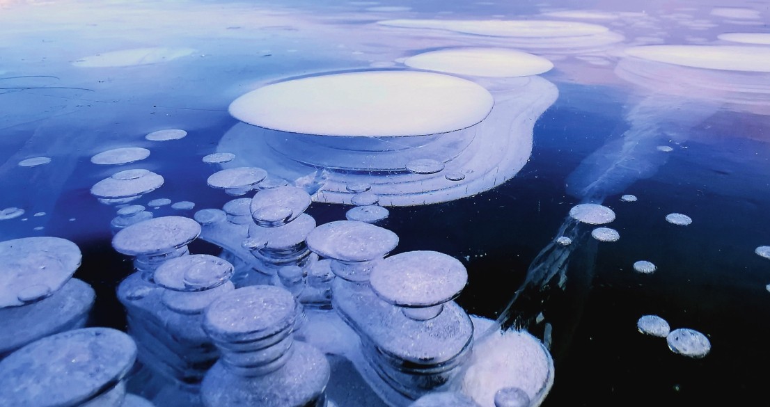 那些冻结在冰中的可爱气泡,其成因却令人费解。有关资料显示,目前世界上仅在加拿大的亚伯拉罕湖、俄罗斯贝加尔湖以及我国新疆的赛里木湖、黑龙江的五大连池等极少数地方出现过这种现象。有专家分析后认为,湖底的有机物在微生物的作用下分解产生沼气(主要成分是甲烷),因湖面结冰使得甲烷气体无法向外排出,便被阻隔在冰层之下。随着温度不断下降,冰层越来越厚,被阻隔的甲烷气体被冻结在一层一层的冰里。所以,那一串串的气泡恰恰是气温不断降低导致冰层不断加厚的直观反映。当气泡从水底逐渐上升时,随着水对气泡的压强减小,气泡体积逐渐增大,有时候,被冻结在冰层下的气泡大得惊人,直径可达半米以上。