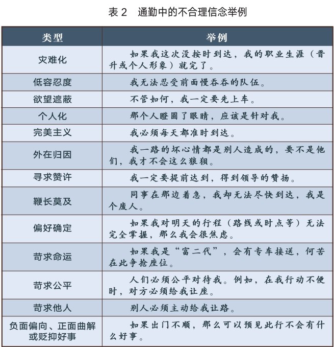 有时候,我们会产生一些不合理信念,使自己陷入无尽的情绪困扰中,而如果一直与情绪纠缠不去行动,外部世界也不会发生任何改变。不合理信念常常表现为绝对化的要求、过分概括和灾难化等特征(见表2)。它们通常包含“必须”“一定”“应该”等措辞。例如,那些经常认为事情“应该”如何的人容易愤怒,因为现实并不总是符合他们的期望。比如,在等待地铁或电梯时,人们普遍认为“应该先下后上”,如果有人不这么做,就可能触发某些乘客的应激反应。