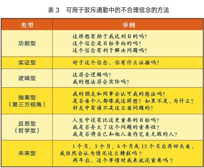 如果我们不能灵活调整自己的认知,或者不能接受世界偶尔的“失序”,那么我们就会持续受到情绪应激的困扰。识别到头脑中的不合理信念后,可以尝试通过一些问题质疑自己的信念(见表3)。只要稍加注意,我们就能与通勤中的不合理信念进行对质,进而将其瓦解。