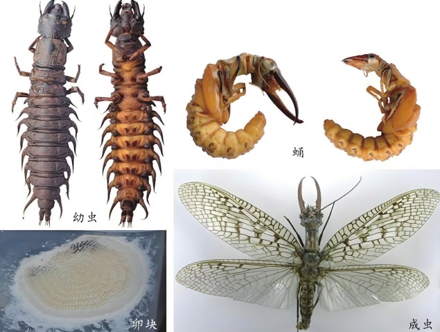齿蛉科幼虫会在水中生活好几年,躲藏在流速较快的石块底部,又喜欢在沙中爬行,因此得名“爬沙虫”。爬沙虫体形修长,前口有一对大夹子,腹部两边有很多类似“脚”的须,这是它们的呼吸鳃;腹面两侧的白色绒毛状物被称为毛簇,也可辅助呼吸。因为这样的外部形态,所以它们又有“夹夹虫”“水蜈蚣”的俗名。爬沙虫为肉食性,性情凶猛,不仅捕食水中的浮游生物、底栖的无脊椎动物,当食物不足或生存空间受挤压时,同类幼虫之间还会出现打斗抢食甚至自相残杀的情况。爬沙虫的口器具有发达的镰刀状上颚和直杆状下颚,前足前端有锋利弯曲的爪。发现猎物后,它们会突然转头,用大颚将其夹住;如果猎物体形较大或者剧烈挣扎,它们就会用前足辅助制服、进食。通常,取食一只摇蚊幼虫,爬沙虫只需用时30秒。