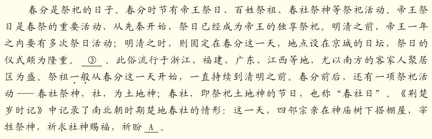 第③处空白横线前后都是句号,说明单独成句。从下文“此俗流行于……,尤以南方的客家人聚居区为盛”可知,“此俗”指代一种 “习俗”。结合上文“春分时节有……等祭祀活动”、横线前主要介绍帝王祭日以及第四段总说性质的第二句来看,这里最适合介绍百姓祭祖,因此横线处可填“百姓祭祖也在春分举行”。