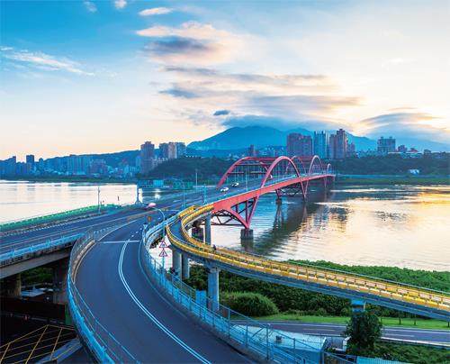 设计特点:其中主桥为长五跨中承式连续拱桥,长539米,其跨径布置为:44﹢143﹢165﹢143﹢44米,由林同炎担任结构顾问,融入创新预应力技术。红色主拱圈为标志性设计,兼具力学支撑与视觉美感,桥身线条流畅,与淡水河自然景观相融合。
