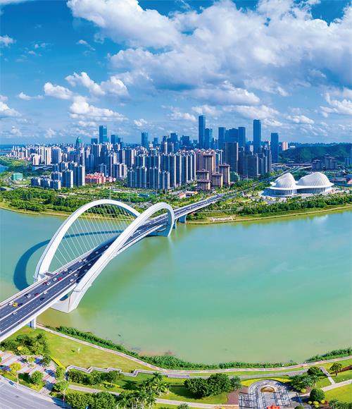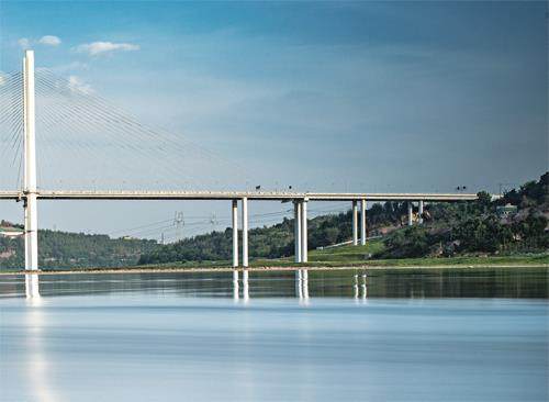 设计特点:这座桥全长956米,主跨388米,采用了高低塔双索面钢混叠合梁斜拉桥的形式。其桥塔采用了无横梁高低双塔形式,桥面视野开阔,总体恢弘大气。主桥采用了钢混叠合梁技术,充分发挥了钢筋与混凝土两种材料的优势,经济合理且低碳环保。