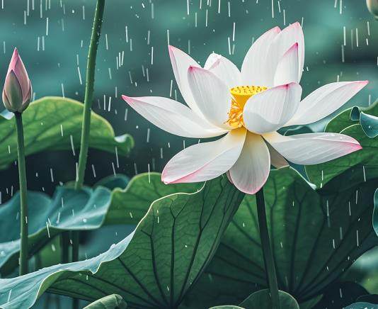 降水对荷花生长也有着不可忽视的作用。适量的降水能为荷花生长提供充足的水分,让它在水中尽情舒展身姿;但如果降水过多,尤其是在其生长的关键时期,就可能带来不利影响,抑制其呼吸作用和对养分的吸收,从而使它们生长放缓,花期推迟,甚至导致花朵凋零。荷花生长的理想降水环境是年降水量800 ~ 1600 毫米。暴雨冲击测试表明,荷叶表面超疏水结构可使80% 的降水在30 秒内滑落。这种特性既保证了荷花叶面呼吸孔的畅通,又避免了积水造成的真菌感染。在武汉东湖的定位研究中,持续15 天的阴雨天气使荷花根状茎(即莲藕)淀粉含量下降19%,但随后3 天的晴朗天气即让这些荷花的根状茎淀粉含量恢复至正常水平的93%,显示出荷花强大的调节能力。