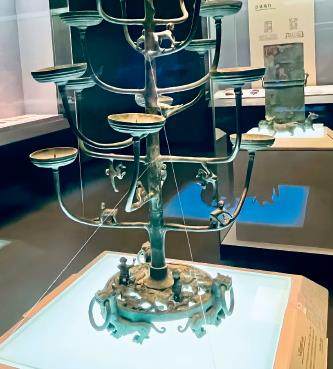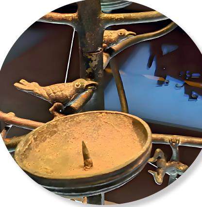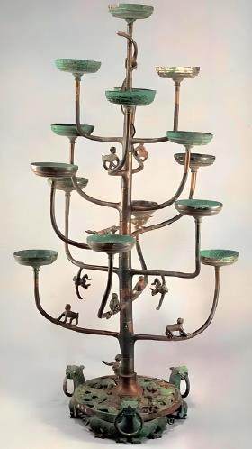 了解光学基本原理的读者知道,如果物体两侧都有光源照射,那N27CfgRn5su3HFGdbcCoeN6chckyRb9xuMozrGNAVS0=么中间部分会叠加形成特别暗的区域,称为本影;而周围则会形成略浅的影子区域。如果继续在物体的周边增加光源并有足够的亮度时,那么本影就会逐渐变小甚至消失。这就是现代手术无影灯所依据的原理。古代工匠可能并不知道什么是本影,但是在长久的生活经验的加持下,他们巧妙地利用高低错落、位置不同的灯盏来消除影子,达到了无影的效果。如果俯视这件灯具,可以发现它的灯盘从内向外均匀排列形成了一个以灯柱为中心的大面积圆形光源区域,同时每根树枝都呈两两对称状态分布,保持了整个灯具的平衡稳定性。