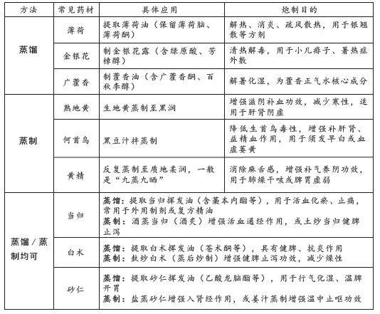 这两种方法经常用在中药炮制上,很多中药材的熟化过程都采用蒸馏或蒸制的方法,甚至有些药材既可以通过蒸馏提取有效成分,也可以通过蒸制增效减毒。下表所示是笔者整理的几种常用保健药材蒸馏与蒸制的具体应用。