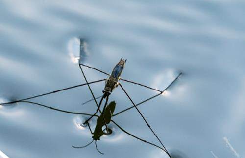 首先来看看水黾在水面快速运动而不湿身的原因。我们知道,力的作用是相互的。物体要运动,必须要先给其他物体一个作用力,然后在其反作用力下完成运动。水黾靠足支撑于水面,通过划水完成运动过程,但它们的足又细又长,按理说,受力面积小、压强大,划水时应该打湿身体才对,为何它们能健步如飞而不湿身呢?这主要得益于水黾足部和腹部特殊的刚毛。这些刚毛的平均直径只有几微米(人头发的直径为60~100微米),众多刚毛按同一方向排列并呈螺旋状聚在一起,通过吸附空气以形成气膜,使其足部能支撑超过自重十几倍的重量。同时,水黾腹部密布的刚毛也有一定的疏水性,让水无法沾湿水黾的身体。也就是说,细密且疏水性的刚毛是水黾能轻松浮于水面且不会湿身的秘密所在。当然,水的表面张力也是保证水黾能在水面行动自如的物理因素。表面张力指液体表面层由于分子引力不均衡而产生的沿表面作用于任一界线上的张力。通常,液体温度越高,表面张力越小。