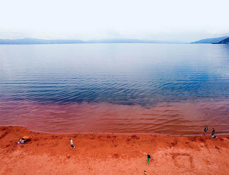 抚仙湖的自然风光四季各异,美不胜收。春日,桃红柳绿,万物萌动,一片生机盎然;夏日,碧波荡漾,清风徐徐,是避暑的绝佳去处;秋日,金风送爽,湖光山色更显宁静致远,渔舟唱晚如诗如画;冬日,群山银装素裹,湖面如镜,别有一番风味。更有趣的是,在抚仙湖西岸的红山咀,有一片颜色鲜艳的粉红色沙滩,细腻的砂砾经湖水冲刷与阳光折射,呈现从浅粉到深红的梦幻色彩,这里因而被游客们戏称为“小马尔代夫”。