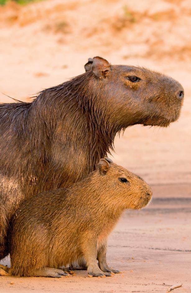 卡皮巴拉的学名为水豚,是世界上最大的啮齿类动物,成年个体体长为1~1.3米,体重为35~66千克。虽然体形庞大,但水豚看起来毫无攻击性,神情温和淡定,是动物界的“佛系”代表。
