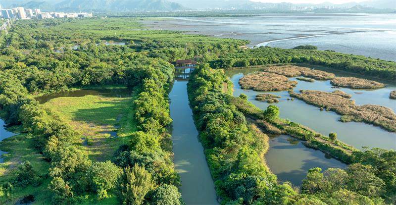 福田红树林自然保护区位于深圳湾东北岸,是全国唯一处于城市腹地、面积最小的国家级自然保护区,也是深圳湾滨海湿地的核心组成部分。这里孕育着全国最完整、最典型的潮间带红树林湿地生态系统,生长着秋茄、白骨壤等12种红树植物,为200余种鸟类提供了栖息、繁殖和迁徙停歇的家园,其中包括黑脸琵鹭、黑嘴鸥等濒危物种,是东亚—澳大利亚候鸟迁徙路线上的重要“驿站”。作为城市中的“绿色肾脏”,红树林不仅能净化海水、固碳储碳,更在抵御台风、减缓海岸侵蚀等方面发挥着不可替代的生态作用。近年来,通过实施生态修复、鸟类监测、科普教育等工程,深圳让这片“海上森林”与城市建筑融为一体,已成为展现人与自然和谐共生的窗口。