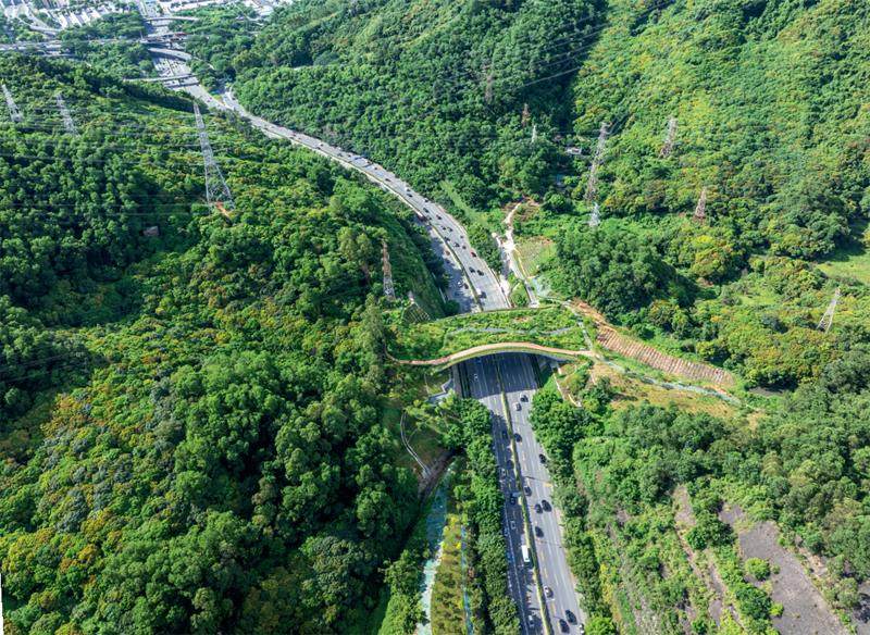 2021年, 深圳“ 山海连城” 计划开始启动,将少年的纸上蓝图转化为民生工程:3000余名市民参与设计投票,院士团队优化结构,最终形成“十分之一桥面行人道+十分之九生态基质”的颠覆性方案—桥上模拟自然山体,铺设豹猫喜爱的藏身处石碓、鸟类滑行的砌石通道,种植80余种蜜源或浆果植物;桥下采用“雾森系统”还原山林湿度,为鼩鼱、鼬獾等中小型兽类迁徙提供走廊。值得一提的是,桥名“鲲鹏径”取自深圳200千米远足径主线,寓意生态“ 鹏程”; 而“ 一号桥”, 则呼应其作为全市首座“双功能廊桥”的里程碑意义。