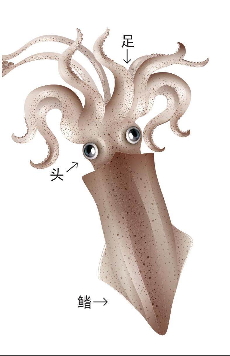 大多数动物的足长在身体的下方,但乌贼恰恰相反—它的足长在身体的上方。乌贼身体下方那尖尖的“头”其实是它的鳍,真正的头长在足的根部,这里还长有乌贼的眼睛和嘴巴。也就是说,乌贼是一种足在头上部、躯干在头下部的动物,我们把这样的动物称为“头足类”。章鱼、乌贼和鹦鹉螺都是常见的头足类动物。头足类动物在海洋中分布十分广泛,它们的典型特点就是“足长在头上”。