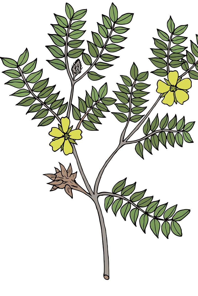 蒺藜的花和果也充满个性。其花两性,腋生于叶间,花梗比叶片短;花萼5片,宿存;花瓣也是5片,雄蕊10枚,生于花盘基部,且花盘基部有鳞片状腺体;子房5棱,柱头5裂,每室有胚珠3、4枚。蒺藜的花朵虽小,但色泽明黄鲜亮,每逢5—8月花期到来时,朵朵黄花如繁星点缀在绿叶之间,醒目动人。