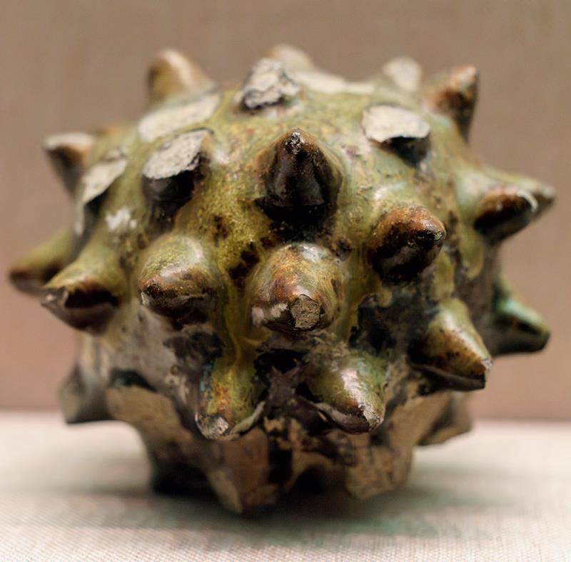 作为冷兵器时代的一种主要御敌军械,自宋代起,铁蒺藜的种类日渐增多,出现了诸如敷有毒药的“鬼箭”、缀于木板上的“地涩”、铺设于水中的“铁菱角”等,进一步提升了铁蒺藜的威力。《宋史》中记载了宋将扈再兴面临金兵进攻,夜间用铁蒺藜铺满地面,黎明时假装撤退,引得金人在追击时马匹被铁蒺藜刺伤,导致行动受阻,军队陷入混乱的事迹。