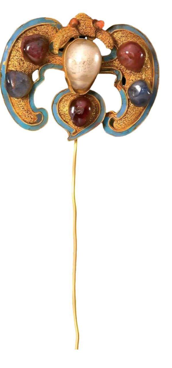 与玉体镶金工艺相反,金基嵌玉工艺是以黄金为基体,然后将玉石镶嵌于金器表面。工匠将金器作为放置玉石的框架,采用铸造、刻、累丝等工艺打造出造型精美、纹饰细腻的金器基底。其中,铸造的作用是塑造结构,让金器更结实;刻是在金器上添上细腻的纹路;累丝则是将金丝编成辫股或网状组织,以便营造出轻巧透亮的审美情趣。进行玉石镶嵌时,工匠还会根据玉石的形状和大小,用爪镶(像小爪子抓住)、包镶(金边包住)或槽镶(卡在金槽里)等方法,确保将玉石镶嵌得既牢固又美观。
