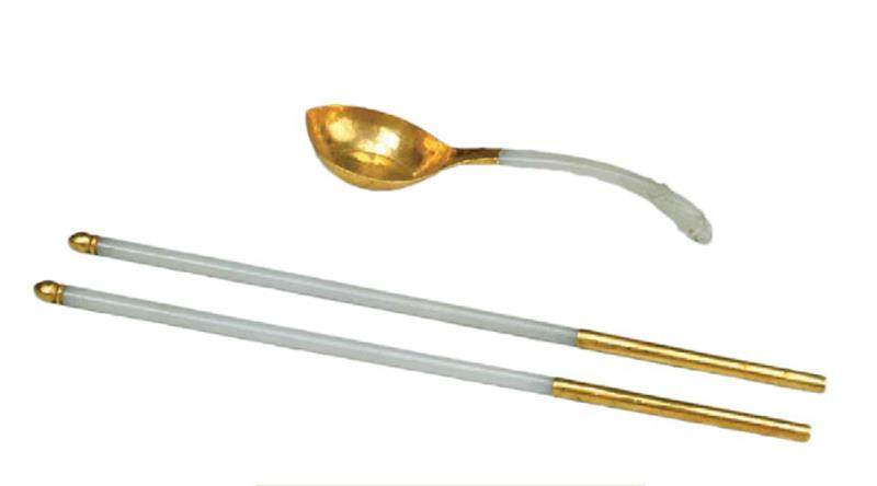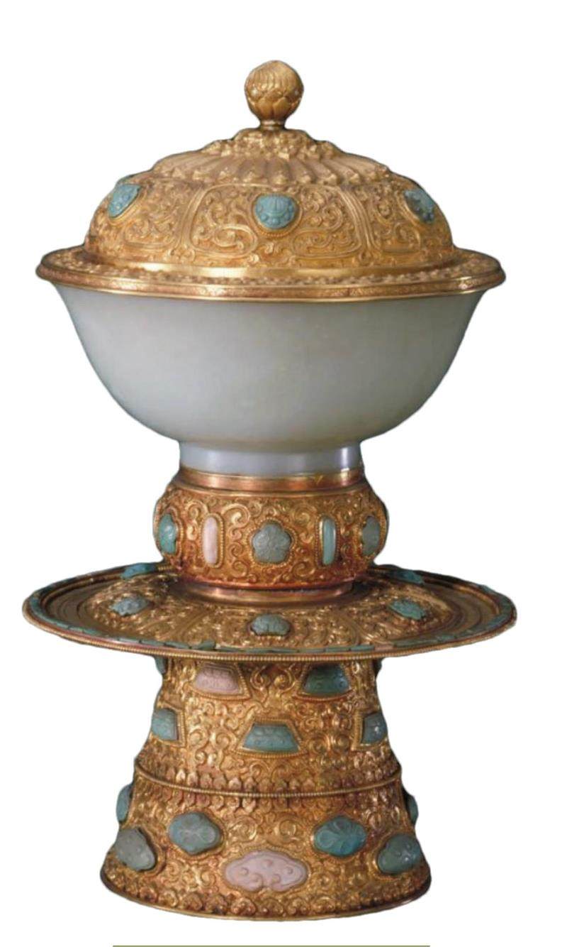 北京故宫博物院收藏的金鳌花高足托盖白玉碗是金托承玉的经典范例。该金器由金托、玉碗、金碗盖三部分组成,高26厘米,口径14.5厘米。其中,金托下粗上细,圈筒式,其外饰有凸起的勾莲纹和数排如意纹,并嵌有松石海棠花、如意云,为玉碗增添了几分灵动与活泼的气息;托盘中心微微隆起,恰好与玉碗底部契合,使放置其上的玉碗更为稳固安全;玉碗由优质白玉雕琢,线条流畅,造型典雅,洁白如脂;碗盖同样为金质,饰勾莲纹并嵌松石饰片。将盖着金盖的玉碗置于金托之上时,金与玉相互映衬,既实用又有很好的陈设效果。