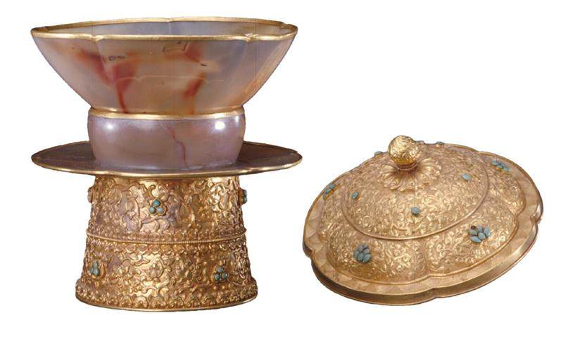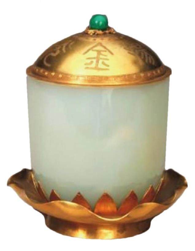 此外,北京故宫博物院珍藏的金盖托白玉杯、金鳌花高足托盖玛瑙碗、玛瑙镶金口带托盖葵瓣碗均采用此种工艺。从总体上看,清代宫廷使用的盖碗种类很多,但金、玉组合的作品较少,所以此类器物异常珍贵。