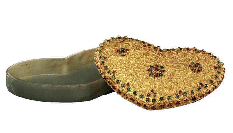 金托承玉,是将金与玉各自做成部件后,以金器为托,将玉石置于其上,通过承托结构组合成一件完整的器物。金托的形状有很多种,工匠会根据玉石的情况、器物用途和整体设计来确定,常见的有托盘、支架、底座等。之后,工匠会在金托上以錾刻、浮雕等手法装饰龙凤、缠枝莲、云纹等图案,既寓意吉祥,又能显出皇家的威严和豪奢。